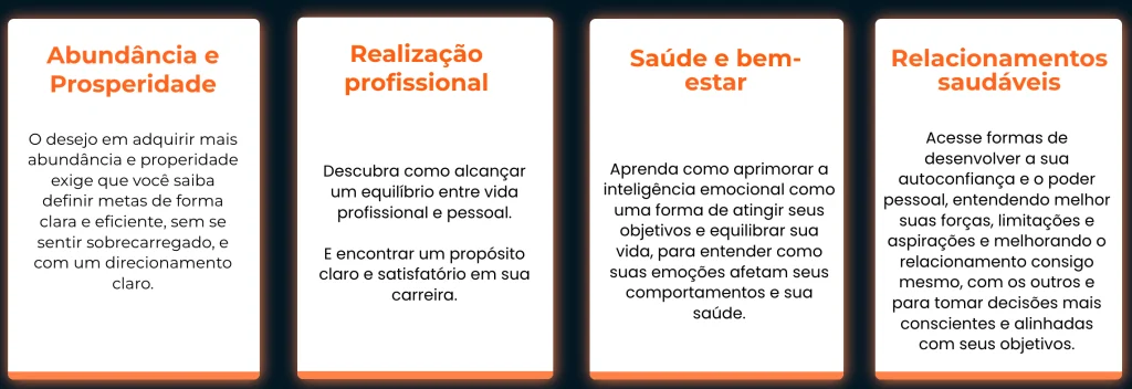 Você vai aprender a equilibrar o que pensa e sente, criando atitudes que te levam diretamente ao sucesso em qualquer área da vida. Você vai aprender a dominar suas emoções, superar barreiras e alcançar seus objetivos com mais clareza e confiança.